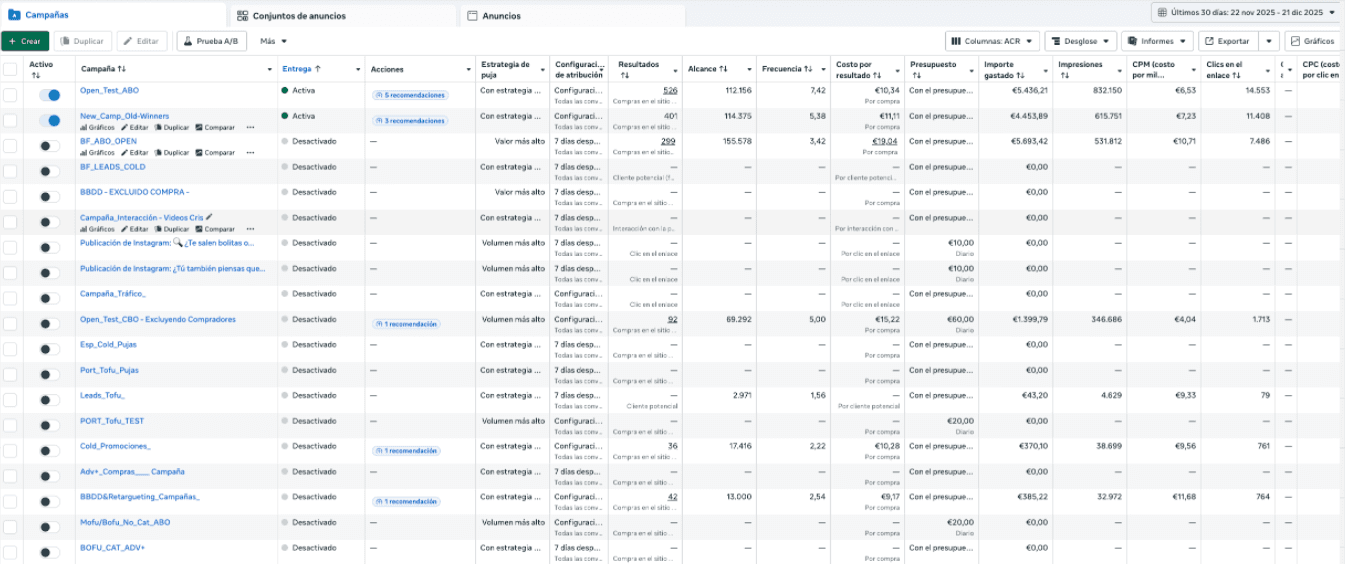 Dejamos atrás las configuraciones básicas. Implementamos arquitecturas de campaña complejas en Meta Ads, utilizando exclusiones de audiencias, lookalikes de alto valor (basados en LTV) y estrategias de puja manual (Cost Caps) para ganar las subastas más competitivas y maximizar la rentabilidad de cada euro invertido.